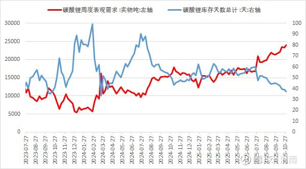 这张图表是碳酸锂周度宏观需求表,按照这个表格,最近11周碳酸锂的需求呈现连续环比增加的态势,并且截止在2025年10月27日当周需求量超24088吨。库存则缩减至12.7万吨,库存周转天数≈35天。