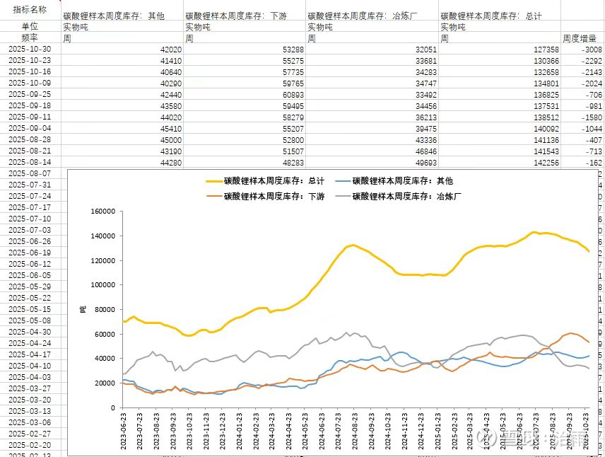 从2025年8月14日开始,碳酸锂已经处于连续11周去库存的状态,而且碳酸锂去库存的速度呈现逐步加快的状态,本周去库存的速度应当会进一步加速。10月最后一周我原本预期库存去化的速度能达到3500吨,实际去化3008吨。数据偏差不改大方向,因为近期碳酸锂产量竟然出现环比下降的现象,考虑到11月电芯排产环比增加11.2%。单周库存去化速度会很快突破4000吨。