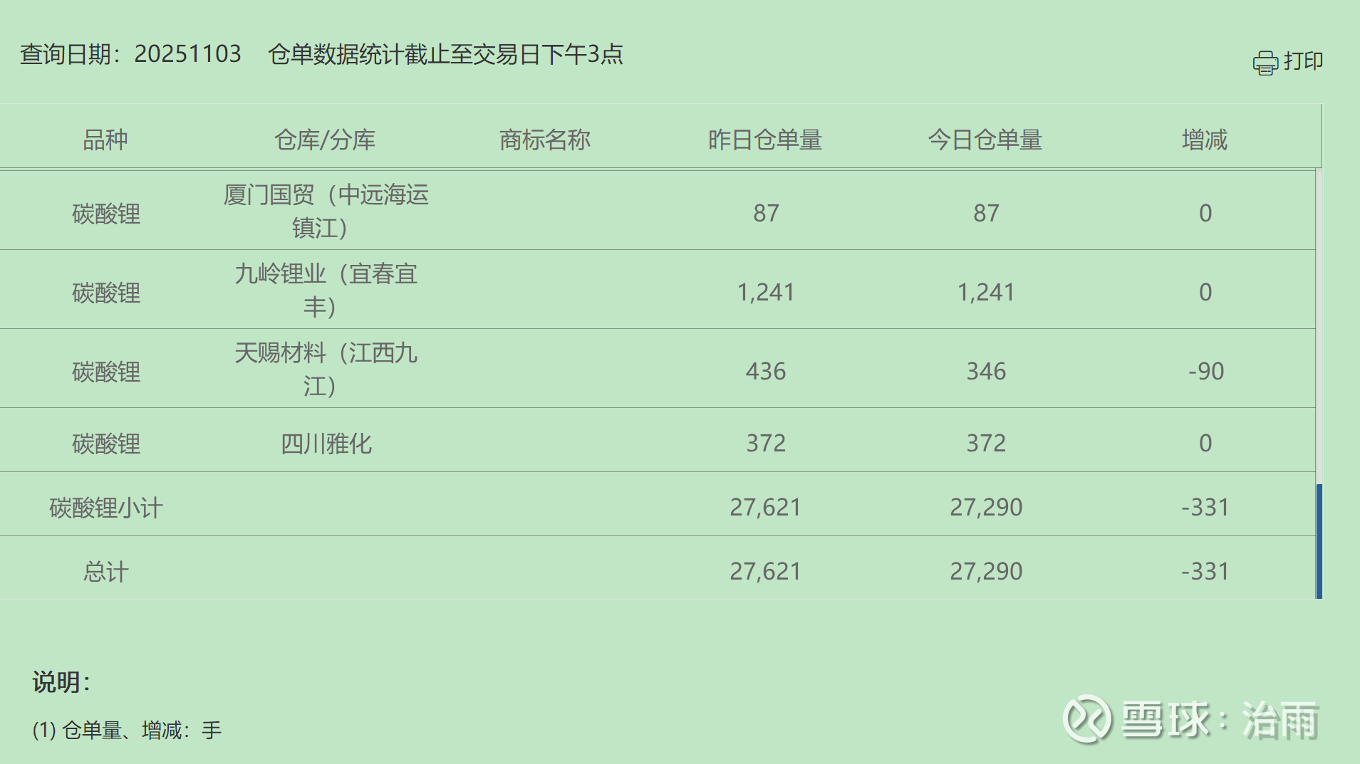 我的上一篇文章在2025年10月29日发表以来,广期所仓单数据更新四次,分别是10月29日、30日、31日;11月3日。这四天仓单变化情况分别是:+190吨、+116吨、-20吨、-331吨,四日合计仓单变化-44吨,就是说经过期货交易所检验认可并存在指定仓库的碳酸锂库存减少44吨。截止到2025年11月3日仓单余量为27290吨