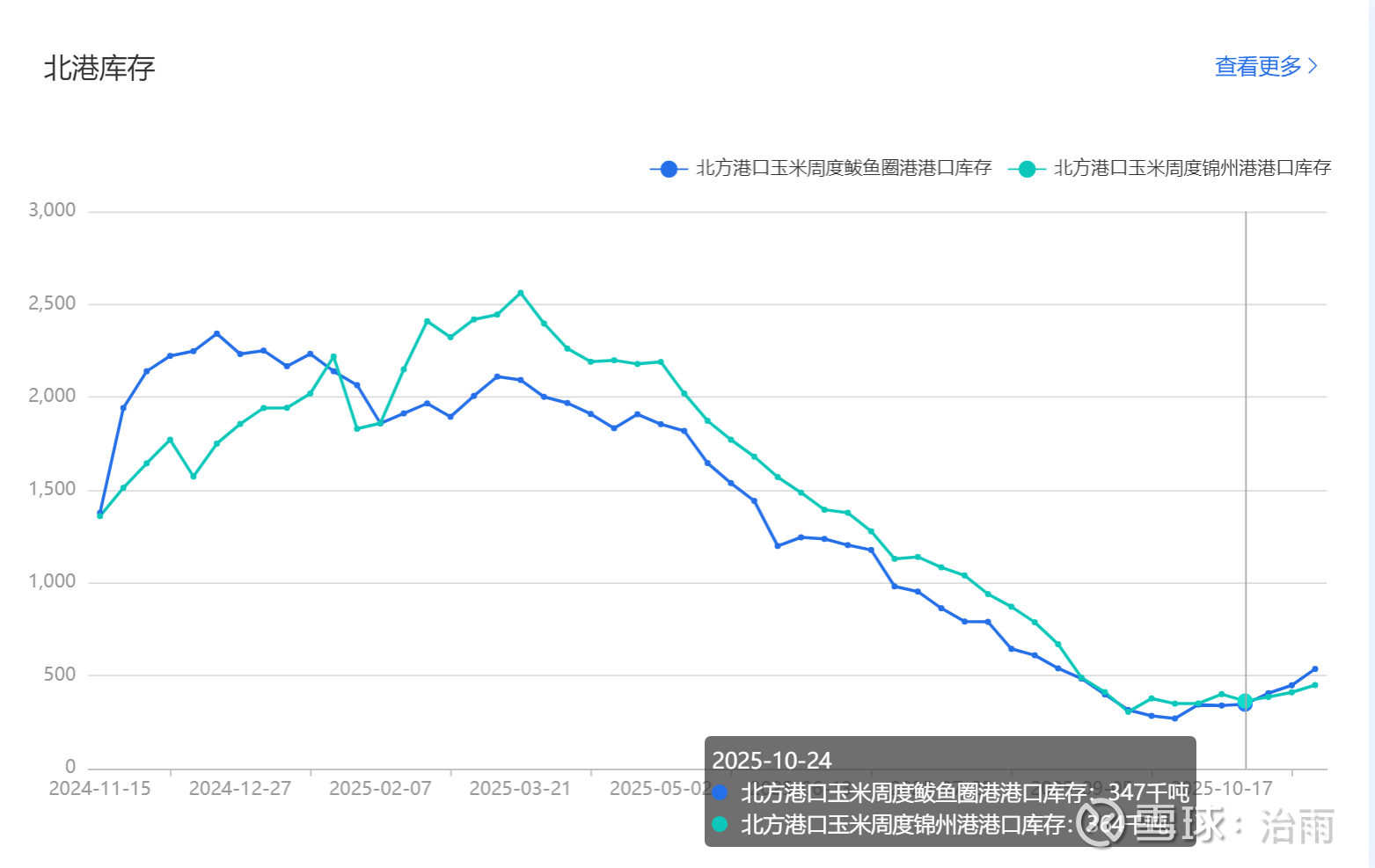 若时间回到2024年,在秋收季节,粮食在低位趴了持续超4个月,足够让大家不徐不疾的逐步建库,所以来到今年觉得时间还早,却浑然不知市场环境已经发生翻天覆地变化:秋收结束了,未来一年的原料库存却没有建起来,一致反向预期落空,便是癫狂时:在本应该是能底价低位建立库存的时期的一群需求方,猛然发现本应该在这一时期合理见涨的库存却在持续下掉,瞬间慌了神。我作为一名跨产业研究者,这样的现象见过太多遍,早已见怪不怪,只剩这些一脸懵的玉米需求方在风中凌乱。从而有了从10月31日以来,鲅鱼圈港现货价格从2080元到今日的2180元的“巨涨”,但港口到岗车辆却还在减少,熟悉农产品期货的人应该明白,两周时间这样的涨幅,对于农产品而言,是罕见的,这波行情,才是在起点。