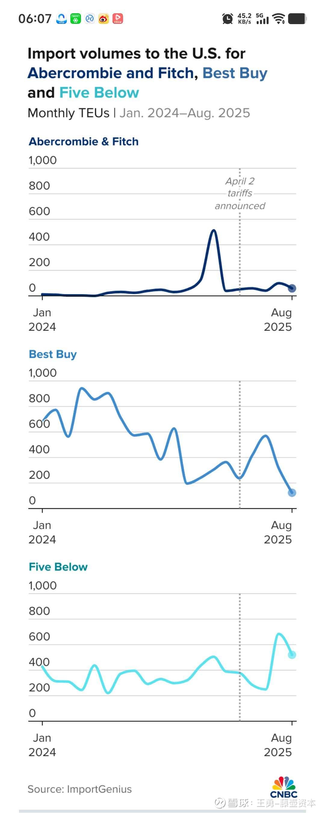 根据ImportGenius的数据,Abercrombie在1月份将大部分运往美国的货物提前装运,4月份中国关税下调后,前期装运量有所减少。
