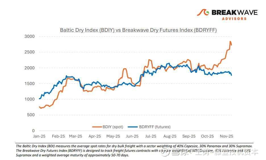 当前好望角型散货船现货运价处于4万美元区间,而1月期货合约成交价徘徊在2万美元低位,干散货市场似在为现货运价的大幅回调蓄力,这一走势与历史规律基本一致。从历史数据来看,好望角型散货船现货运价在年末的收官水平远低于当前价位;过去十年间,年末运价区间大致在5000-20000美元,均值接近15000美元。尽管如此,运价指数每多维持一天高位,就会倒逼期货市场做出调整,为潜在的异常行情定价。我们认为,遵循季节性需求走弱的历史趋势,未来数月现货运价或将跌破2万美元关口。虽然西非地区的运量支撑以及活跃的铝土矿贸易有望带来一定提振,但我们判断,新增货流量不足以支撑当前的运价水平。无论如何,市场对此次回调已普遍形成预期。衡量市场基本面韧性的核心指标,将是明年春季的运价回升态势——这将检验干散货市场能否在大宗商品需求增速再度趋于平缓的背景下,继续维持现货运价溢价。