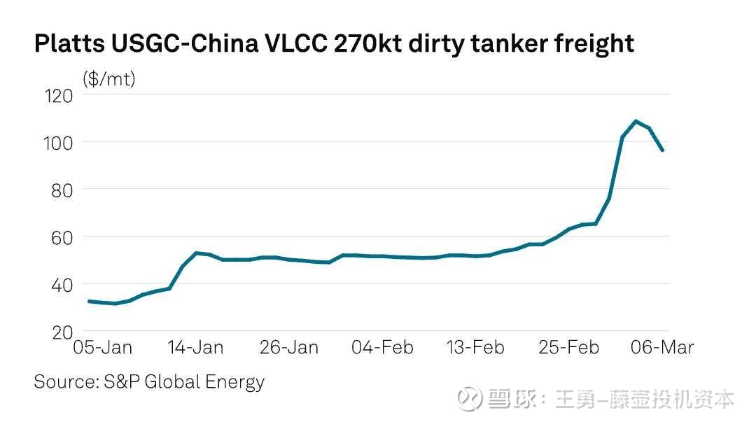 普氏3月6日评估,美湾至中国航线、27万吨级超大型油轮(VLCC)、3月21日—4月20日典型装船期的包干运费为2600万美元(合每吨96.30美元),较3月5日的2850万美元、3月4日历史高点2930万美元有所回落。