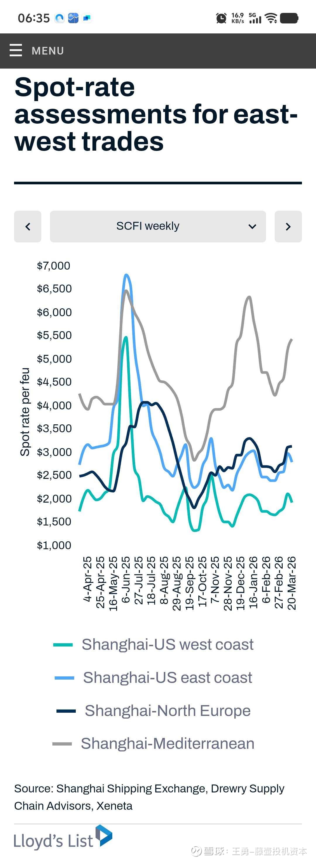 “船公司未能在3月中旬成功推涨北欧航线运价。计划于4月1日再次尝试提价,但市场情绪已开始降温,此前预期的港口拥堵、集装箱短缺等扰动,实际影响小于初期判断。”