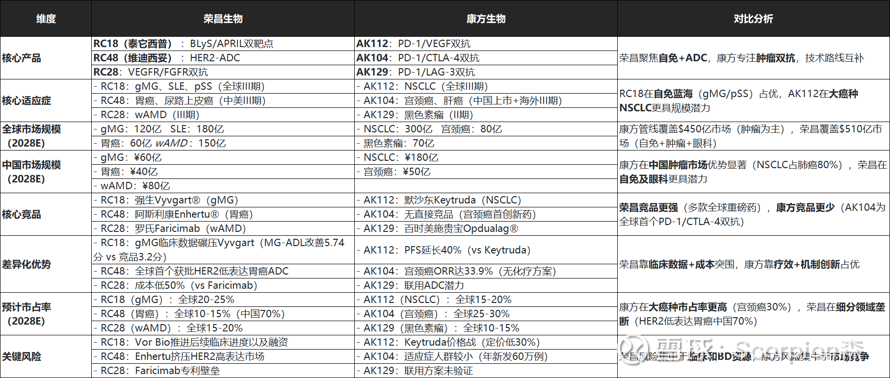 在管线的竞争力上,荣昌的自免领域天花板更高,gMG全球渗透率仅15%(70万患者中10万接受治疗),RC18凭借98.1%症状缓解率(Vyvgart为68%)有望将渗透率提至25%,独占30亿美元的份额,而康方依靠肿瘤大癌种规模制胜,NSCLC占全球肿瘤市场25%,AK112若获批一线治疗,可替代Keytruda 20%份额(约60亿美金),核心优势就是无需联合化疗。