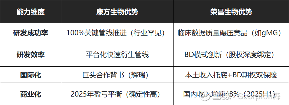康方高增速:核心驱动力为AK104宫颈癌双抗医保放量(2024年谈判获“理想价格”)及AK112海外授权收益沉淀。其商业化团队效率显著高于行业均值(人均产值≈荣昌1.5倍)。