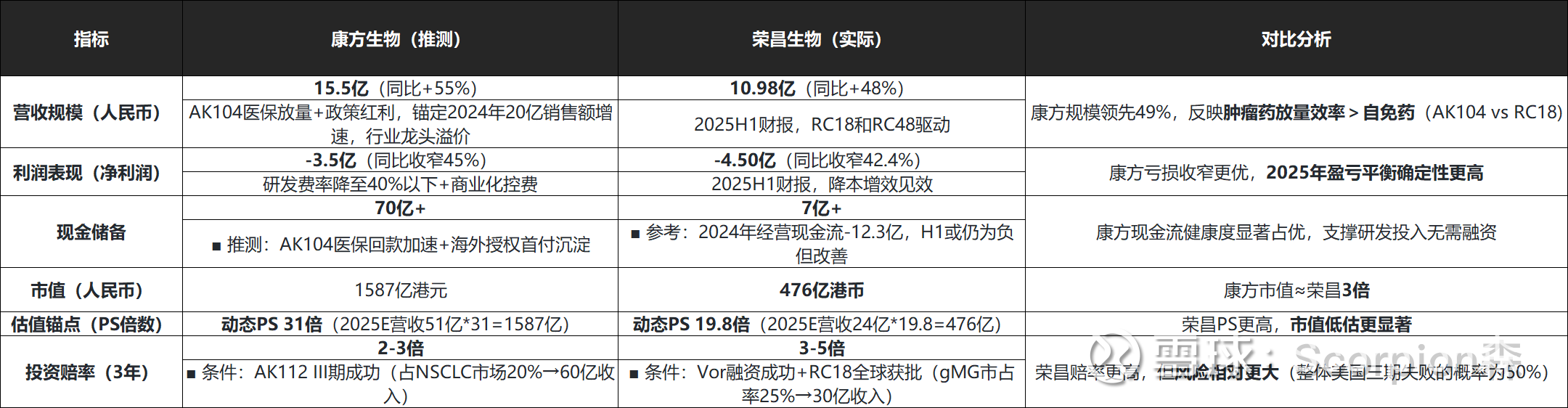 康方现在具备更强的确定性,24年的医保赢家让放量更加确认,账上的现金流健康,双抗平台被辉瑞背书,两家公司的市值也明显体现这部分差异,康方等于3倍多的荣昌,而以动态PS来看,荣昌从业绩兑现的当下看倒更为低估,20倍的动态PS优于康方的31倍。