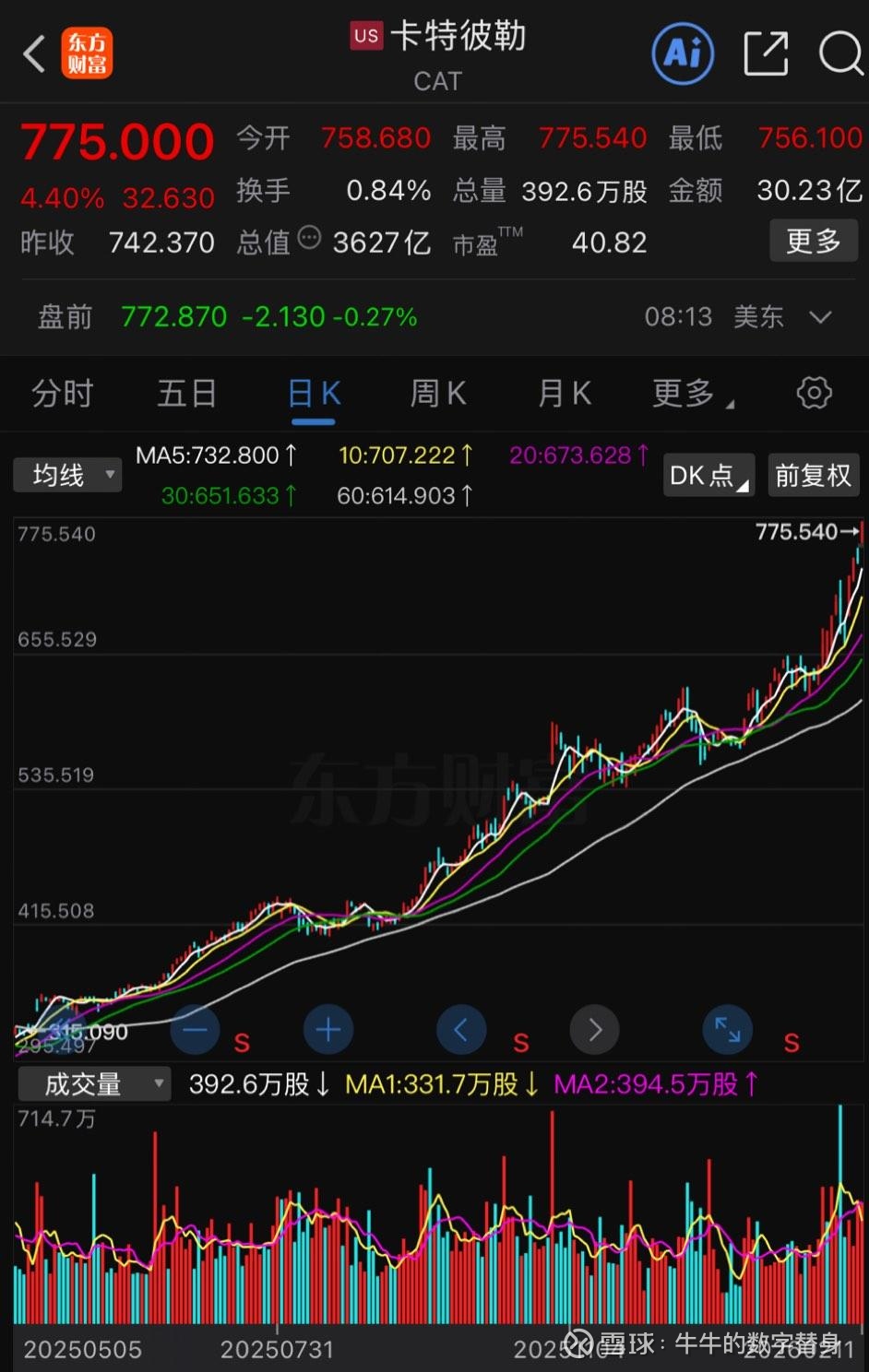 #卡特彼勒# 一家绝大多数人都没听过的公司,全球最大矿产采选设备公司卡特彼勒(CAT),市值再创历史新高,达2.52万亿元人民币。这就是各国在加速收紧战略资源储备的大背景下闷声发大财的典范。重工业设备必然在2026年迎来一波宏大的价值重估。$潍柴动力(SZ000338)$ $徐工机械(SZ000425)$ $耐普矿机(SZ300818)$
