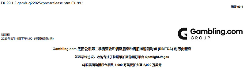 Gambling.com 集团今日还宣布,将通过最终协议收购 Spotlight.Vegas,从而扩展其服务范围。Spotlight.Vegas 帮助消费者通过其在线预订平台获得现场活动和当地景点等体验。拟议交易预计将于 9 月初完成,但需满足惯例成交条件。公司将在收购交割时支付 800 万美元,并在 2027 年底前实现特定业绩目标的情况下,额外支付最多 2200 万美元。公司预计将利用现有现金和未来现金流支付收购款。Gambling.com 集团预计,此次收购将为 2026 年全年带来至少 800 万美元的净收入和至少 140 万美元的增量调整后息税折旧摊销前利润 (EBITDA)。
