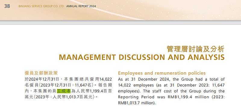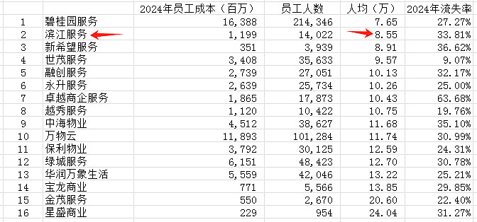 $滨江服务(03316)$ 昨天球友@风之樱意 朋友讲他核算过滨江服务的人均员工成本很低,今天抽空算了下各家的数据,有点震精到:
