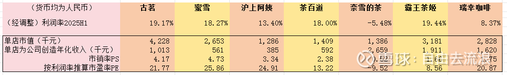 因为单店能创造的年化收入以及进一步的利润差距巨大,单店的市值也差异很大,最贵的古茗400来万一个店,其次的霸王茶姬300来万,然后是瑞幸和蜜雪的260万以上,再然后就是沪上阿姨、茶百道和奈雪的茶的150万以下。