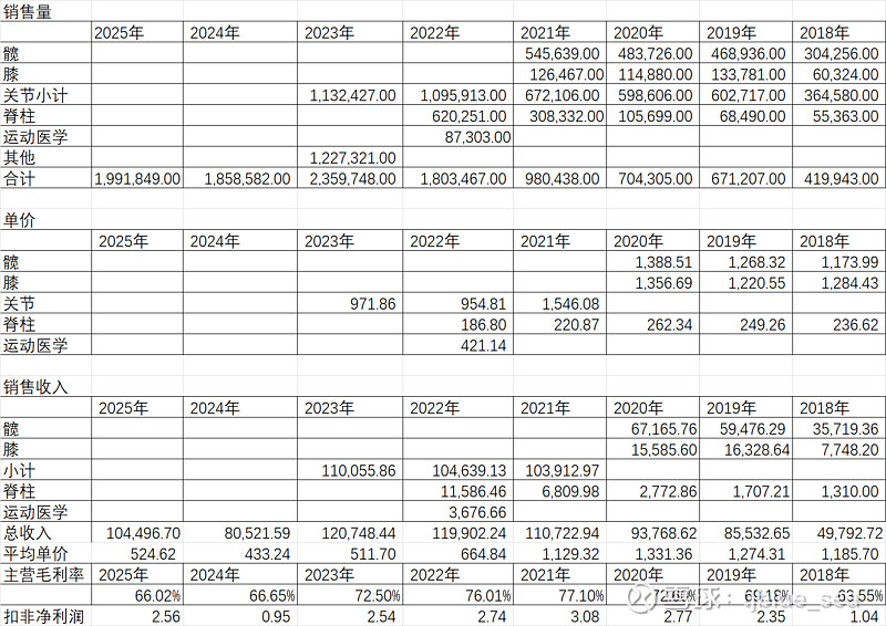 我把2018年 到2025年的销售数据拉了一下,产品品类从2023年开始公司不再细分,算是披露的倒退。2021年是个拐点,因为全面集采。