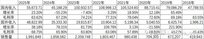 2、国外从2021年开始销售数据近乎完美,毛利率每年都提升,每年都实现了增长,短短5年时间增长了块10倍。当然2025年增长开始放慢,只有这个趋势能够保持就好。