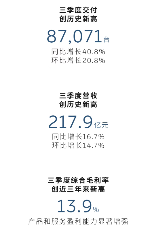 先看最硬核的几项数据。三季度,蔚来交付了87,071台车,同比增长40.8%,环比也增长了20.8%,创下了季度交付量的历史新高。伴随着销量攀升,营收也水涨船高,达到217.9亿元人民币,同样创下历史纪录。更值得玩味的是其盈利能力的改善:三季度综合毛利率回升至13.9%,整车毛利率更是达到了14.7%,两者均为近三年来的最高水平。