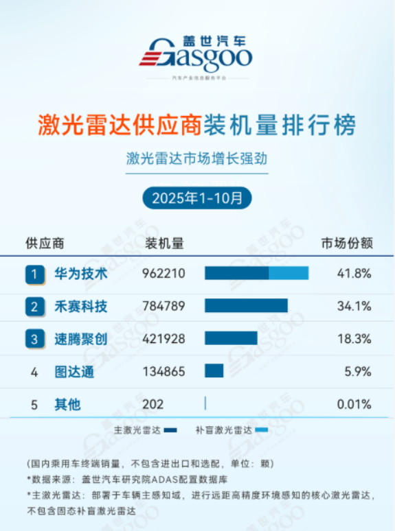 几乎同一时间,盖世汽车数据:2024年1-10月车载主激光雷达装机量,禾赛以绝对优势稳居第一,连续9个月蝉联冠军。