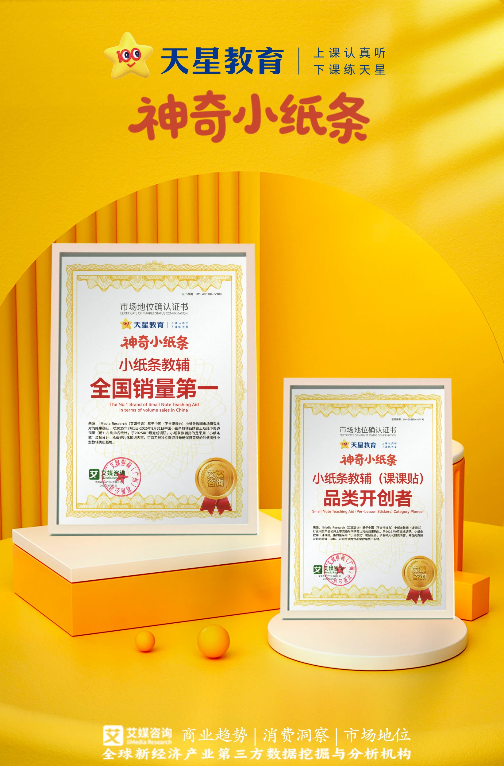 近日,天星教育神奇小纸条获全球领先的新经济产业第三方数据挖掘和分析机构iiMedia Research(艾媒咨询)授予的“小纸条教辅全国销量第一“”小纸条教辅(课课贴)品类开创者”市场地位确认。