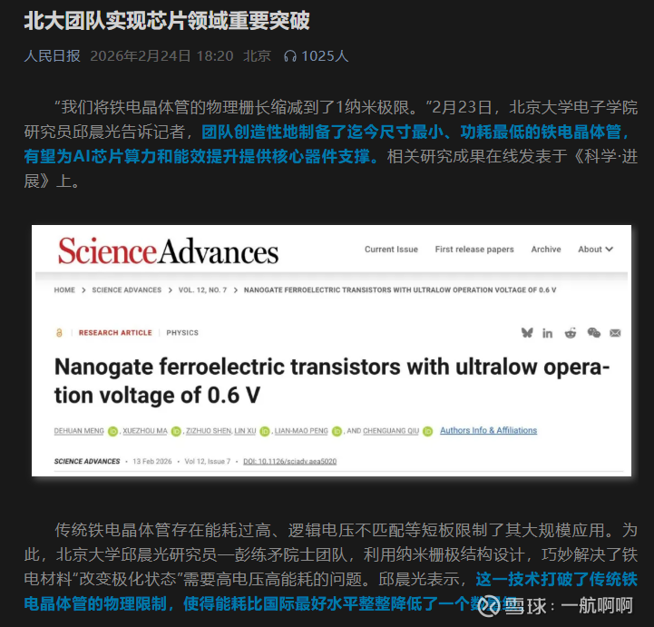 $佰维存储(SH688525)$: 作为国产存储方案领军者,他们在存算一体(PIM)领域的布局非常激进。北大这种FeFET技术一旦进入产业中试阶段,佰维这类应用端企业将最先吃到红利。