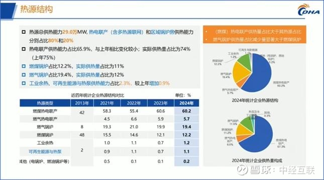 根据中国城镇供热协会副秘书长、教授级高工、协会供热技术专业委员会副主任牛小化在大会主论坛分享的报告《中国城镇供热发展报告(2025)概要》可知,2023年全国集中供暖面积143.24亿㎡,热源结构以燃煤热电联产为主,统计供热企业中近四年热源结构占比变化幅度都不大,2024年燃气锅炉占比19.4%,可再生能源与热泵占比仅1.1%。