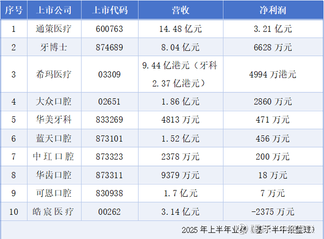 净利润表现更显分化特征。通策医疗以3.2亿元净利润稳居盈利榜首,牙博士6628万元、大众口腔2860万元紧随其后,形成千万级净利润梯队。蓝天口腔(456万元)、华美牙科(471万元)、中玒口腔(200万元)则保持百万元级净利润规模。值得注意的是,可恩口腔虽营收1.7亿元,但净利润仅7万元,同比暴跌99.39%;皓宸医疗更是出现2375.11万元亏损,同比下降4391.18%,成为降幅最大的企业。