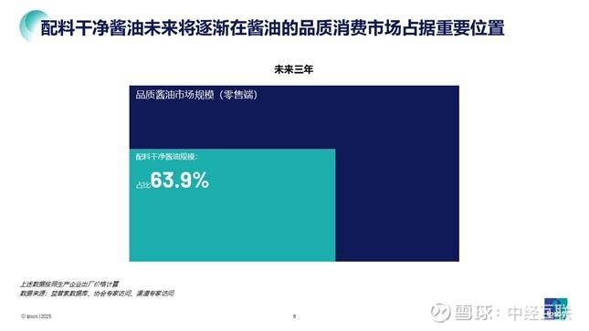 2024年中国酱油市场规模达1,041亿元,酱油消费已从基础性需求转向品质性需求。全球知名研究机构Ipsos(益普索)2025年发布的《配料干净酱油品类发展和趋势》显示,配料干净酱油将逐渐成为中国家庭酱油采购的首选,头部品牌已占据五成市场份额,预计未来三年,配料干净酱油在零售端的品质酱油市场规模中,占比将提升至63.9%。