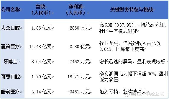 根据2025年半年报数据,在主要上市口腔医疗服务企业中,通策医疗以14.48亿元营收和3.21亿元归母净利润稳居榜首,但其高达91.36%的收入依赖于浙江省内,跨区域扩张成效尚待验证。部分企业如可恩口腔、皓宸医疗等出现了营收下滑或净利润大幅缩水甚至亏损的情况。