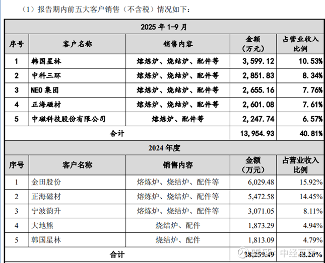 而与核心客户的深度绑定合作,正是广泰真空抢占行业红利、巩固市场地位的关键,而其在稀土永磁真空装备领域的多重核心优势,更是支撑双方长期协同发展的核心底气。合作层面,广泰真空与北方稀土、中科三环等核心客户合作历史悠久、粘性极高,已形成稳定的协同供应模式,其客户群体覆盖国内绝大多数稀土永磁龙头企业,报告期内向前五名核心客户销售占比稳定在40%以上,其中公司是北方稀土高性能钕铁硼生产线真空烧结炉的核心配套供应商,双方合作深度贴合北方稀土产能扩张计划,形成协同发展态势;与中科三环合作基础扎实,公司真空熔炼炉、真空退火炉等核心产品适配其伺服电机用磁材生产流程,双方合作规模随中科三环业务发展稳步推进。同时,公司还与金力永磁、大地熊、宁波韵升等企业保持合作,进一步深化与各核心客户的长期绑定关系。