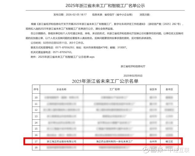2026年2月5日,浙江省经济和信息化厅对成功入选2025年浙江省未来工厂名单的单位进行公示,海正药业“原料药制剂一体化未来工厂项目”成功入选,成为浙江省首个化药未来工厂。