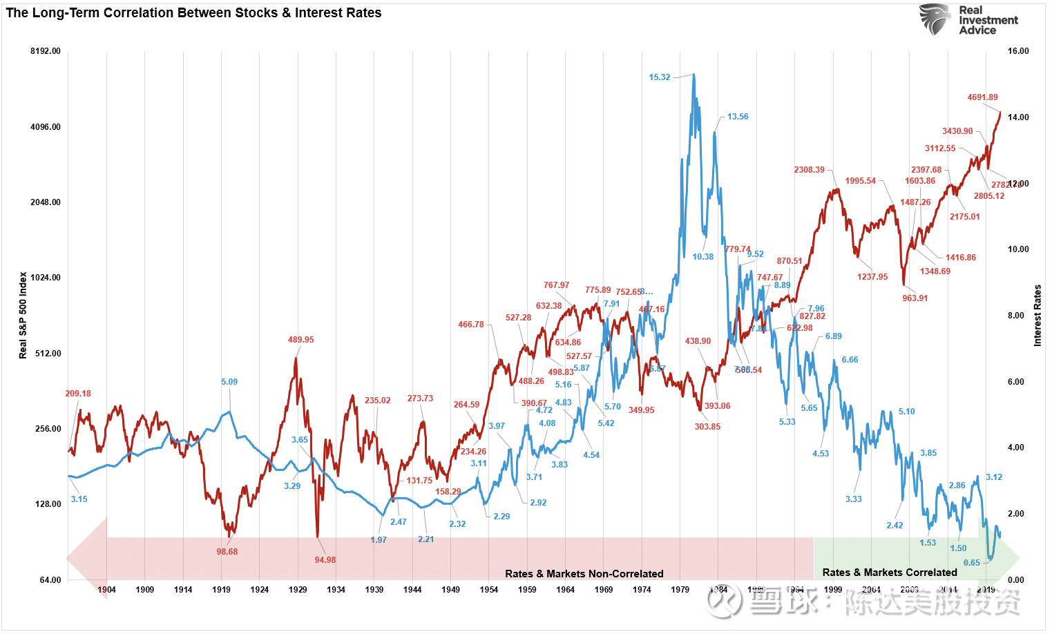 美国股市长期发展的图,拉长到一个世纪的维度,可以看到这种利率与股市的负相关,大体上是很清楚的。