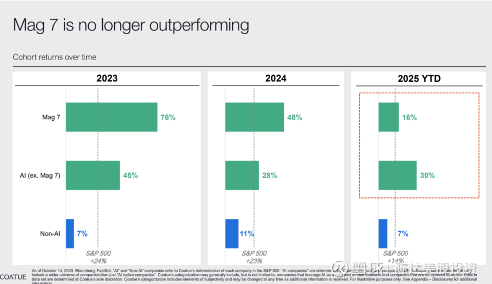 “高不切低”不是A股特有现象,美股与港股,也面临同样的问题。你以为美股牛市很均匀,其实不然。我之前说过美股的牛市很窄,虽然大盘股指屡创新高,但去年是Mag7带头冲,今年连Mag7都熄了主要是AI在带头硬冲,根据Coatue的统计,2025年初至今,标普500涨了15%左右,不算Mag7的美股AI涨了30%,而Mag7 “仅仅” 涨了16%,非AI更是只有7%的收益。标普里的医药保健、金融、能源、消费等等板块,芸芸众低。
