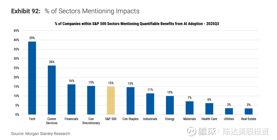 大摩最近有个研报,叫Momentum Around AI Adoption Is Building,核心观点是AI商业化应用拐点到来,AI能为企业创造可以量化的真金白银价值。通过几个可量化维度——1)财务影响:收入增长、成本节约、资本影响;2)生产力:运营与流程效率、整体绩效水平;3)销售与客户增长:营销有效性、客户参与度等等——在自己公司的财报里提到AI带来以上可量化维度改善的公司,比例持续增长。