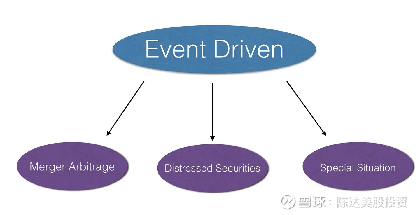 当然这里的“事件”也不包括所有的家长里短与鸡毛蒜皮。一般而言,事件驱动型策略可分为三个大类:merger arbitrage (并购套利,业内也叫merger arb)、distressed securities (困境证券)和 special situation (特殊机会)。