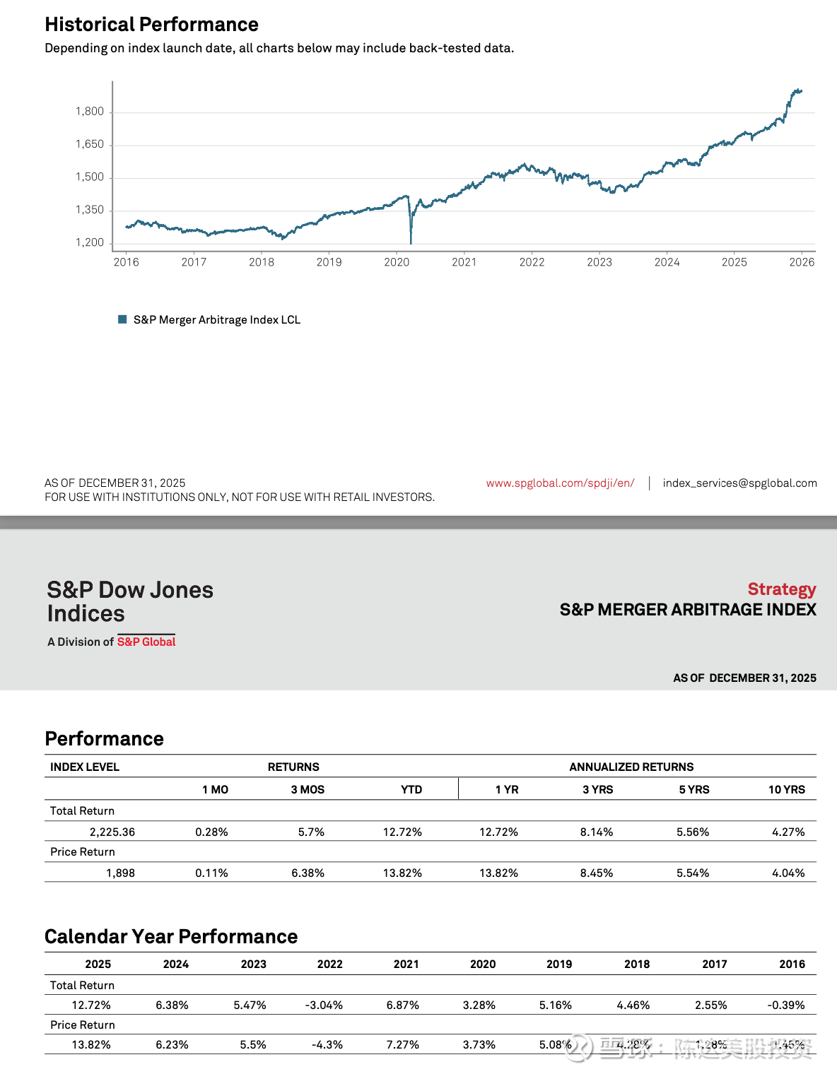 其实如果你不挑不选不做功课不加杠杆,合并套利投资回报其实不会很高,波动性也比较低。下图是不加杠杆的标普并购套利指数(S&P Merger Arbitrage Index,该指数无论何时都包括了正在进行的40个并购交易,包括了40个收购公司的做空仓位和40个目标公司的做多仓位,并配备较多现金仓位)的表现,10年年化收益4.3%,浓浓的固收指数既视感。