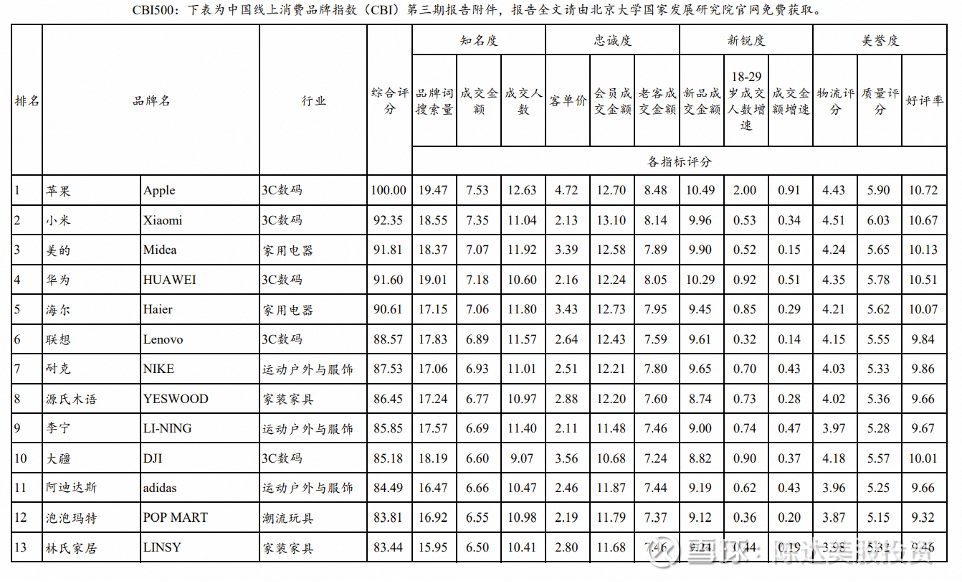 而CBI 这个榜,比较难得是这份榜单中每个品牌的评分维度,计算公式和数据来源都是公开信息,是一个透明盒子,并不简单告诉你苹果比华为排名高,还告诉你苹果与华为的品牌搜索UV、销售额、成交人数、客单价、会员、复购等等,每项指标的评分和权重,背后消费大数据是来自淘宝的真实消费行为。技术层面上是淘天平台的真实消费行为数据。也就是说,在完成全网品牌打分之后,排在前500的品牌,自然形成CBI 500榜单,而不是反过来为了品牌,去“设计”榜单。