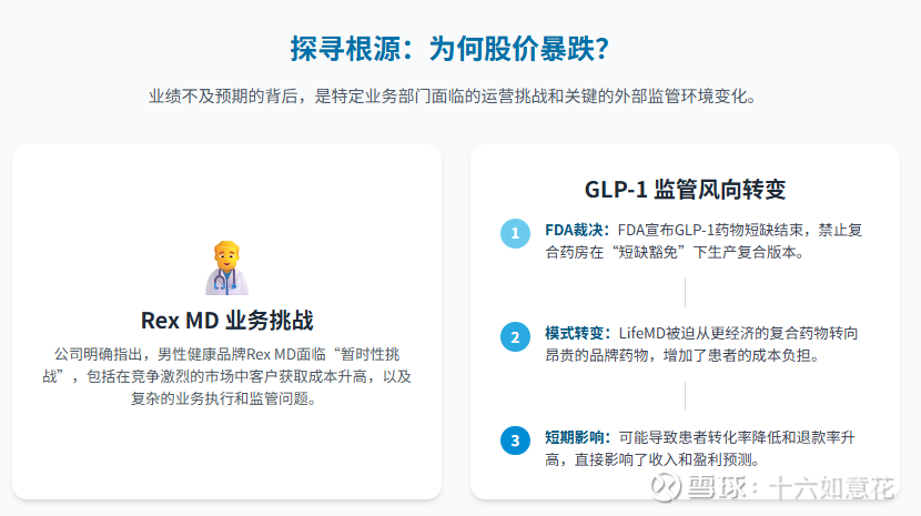 FDA决定终止复合GLP-1药物的“短缺”豁免 ,这是一项直接的监管指令,迫使远程医疗提供商在体重管理领域进行重大的商业模式转变。此前,复合版本为现金支付患者提供了更经济实惠的选择。强制转向更昂贵的品牌GLP-1药物 带来了患者负担能力和保险覆盖方面的新挑战,可能导致没有足够保险的患者退款率更高或转化率更低 。尽管此举增强了监管合规性并可能提高了患者安全性,但它通过增加患者的成本负担,在短期内造成了不利影响,如果Rex MD的产品中包含这些复合药物,这可能会加剧Rex MD面临的“业务执行”挑战 。这标志着一种被迫的演变,考验着公司的适应性和定价策略。