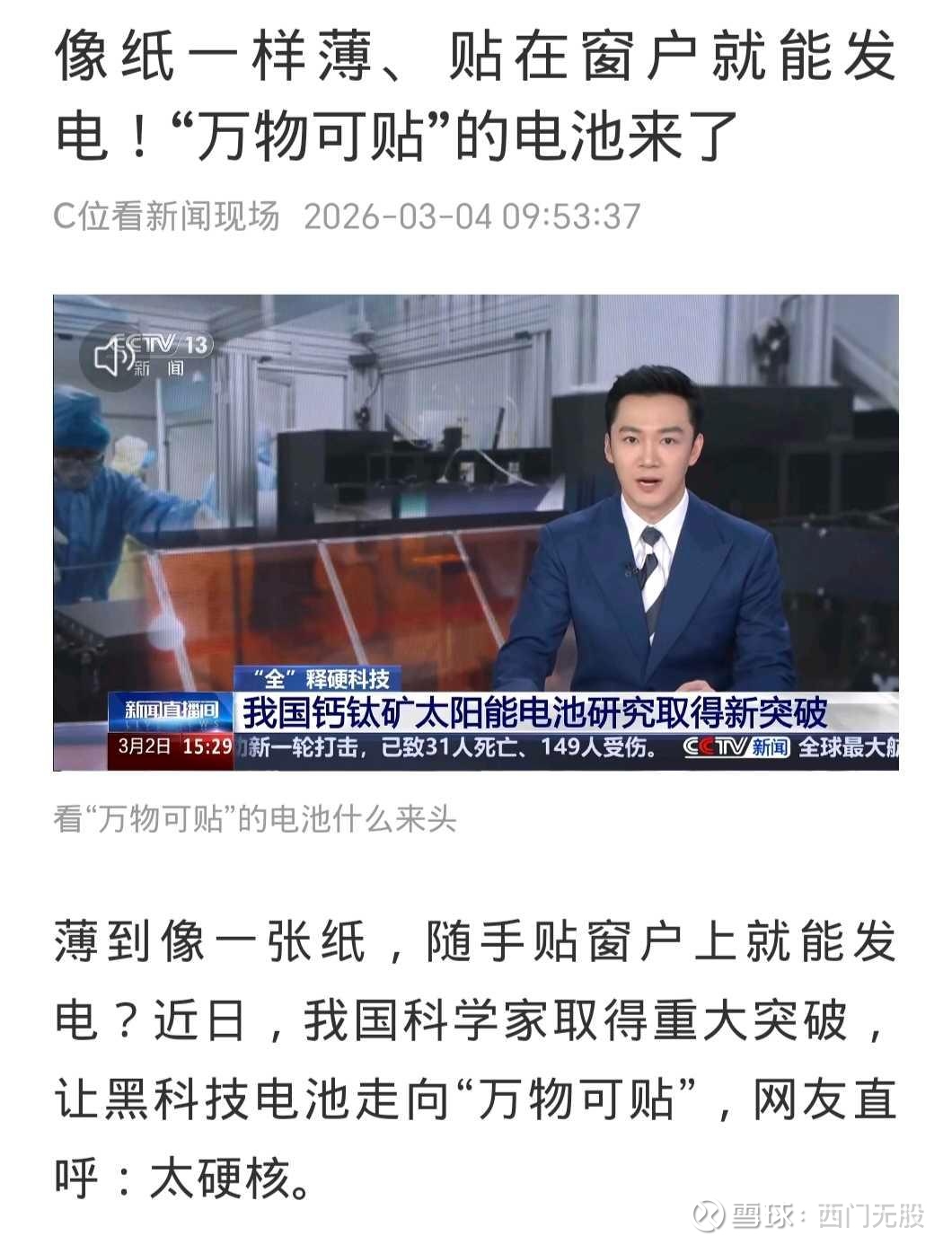 今天,看到央妈报道了一则新闻,我国科学家研发的“万物可贴”超薄电池实现技术突破,薄如纸张、可直接贴附在窗户等载体发电的特性,让钙钛矿电池技术的商业化落地再次成为焦点。这一黑科技的问世,不仅印证了钙钛矿电池在柔性、轻量化、场景多元化方面的独特优势,更让卡位钙钛矿设备赛道的ST京机(000821)迎来发展新机遇,在行业产业化加速的背景下,公司的价值重估正蓄势待发。