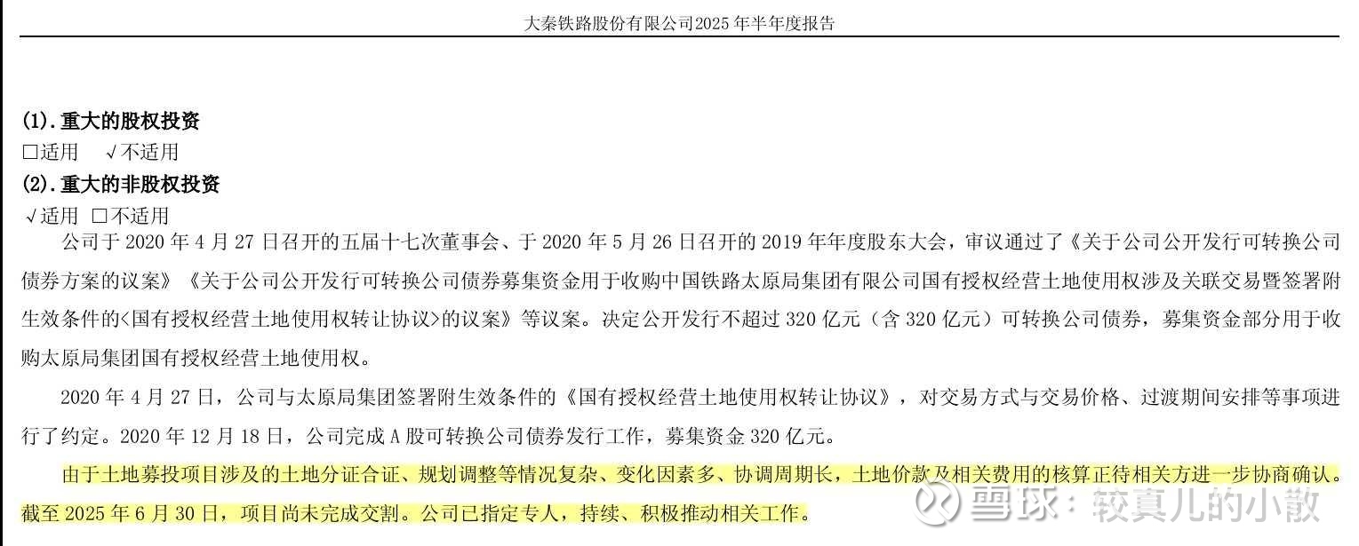 从2020年底发行320亿可转债至今,计划向大股东购买的804宗土地一宗都没完成过户!每年都是同一套说辞——“由于土地募投项目涉及的土地分证合证、规划调整等情况复杂、变化因素多、协调周期长,土地价款及相关费用的核算正待相关方进一步协商确认。截至 2025 年 6 月 30 日,项目尚未完成交割。公司已指定专人,持续、积极推动相关工作。”(下图)