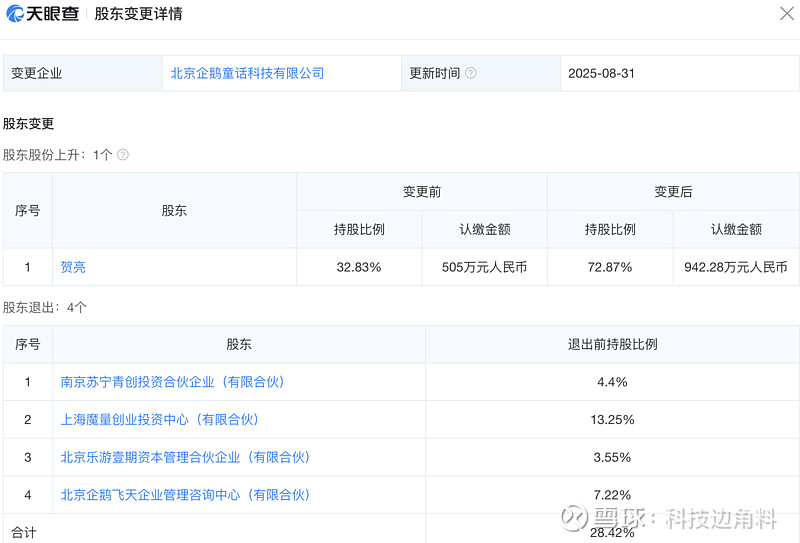 【腾讯退出K12教育公司企鹅童话股东】北京企鹅童话科技有限公司日前发生公司变更,林芝腾讯科技有限公司退出股东序列,退出前持股15.9304%。