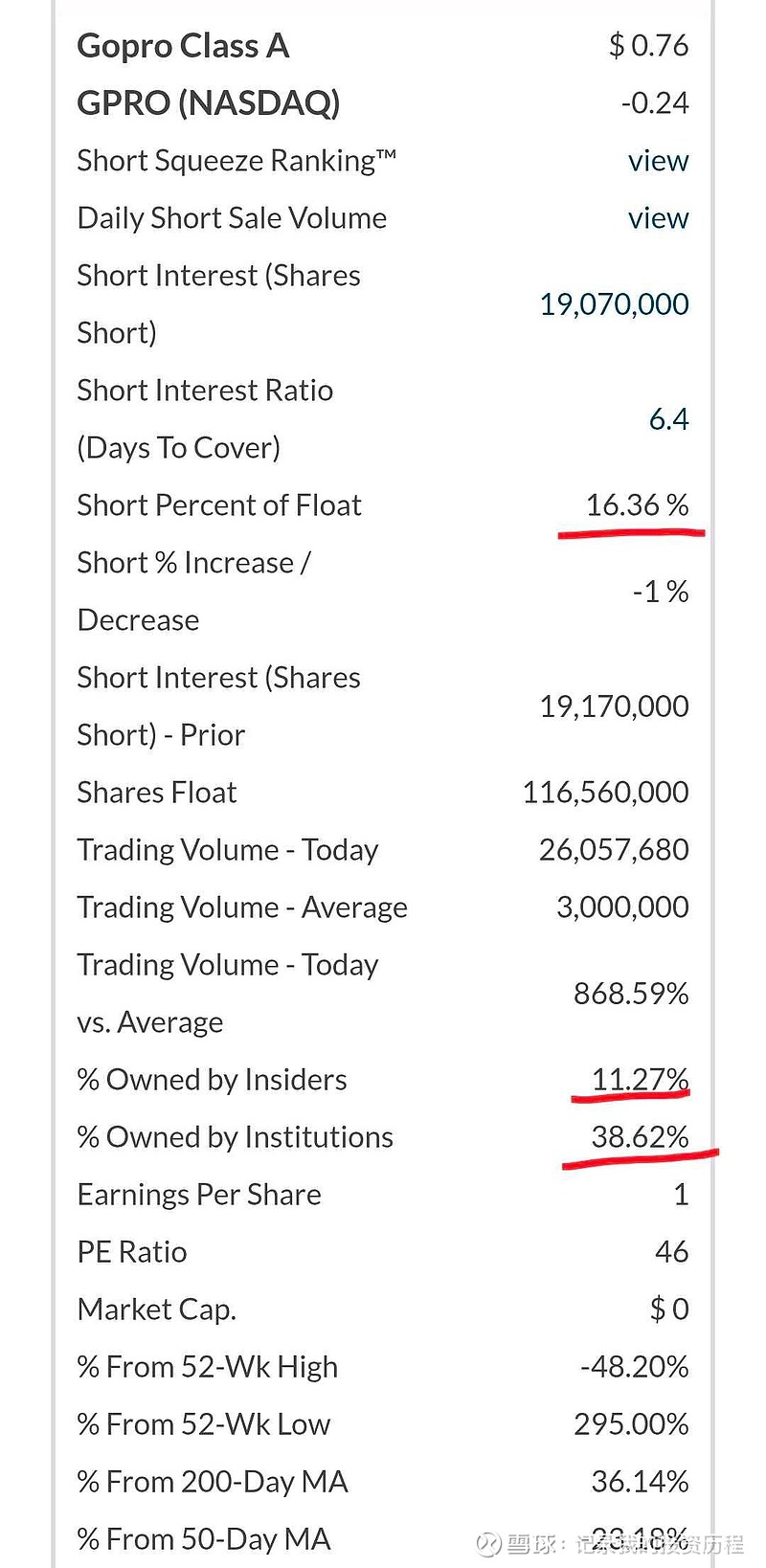 $GoPro(GPRO)$ 16%的流通股被做空,更重要的是机构和内部人士持股占到了50%,那么散户手里的股票都多少被做空呢,接近32%……每三股散户股票,就有一股被空头借走。如果哪天筹码锁死,空头需要 6.4天成交量才能回补。这种结构在美股历史上通常只会发生两件事:要么公司崩溃,要么空头爆炸。