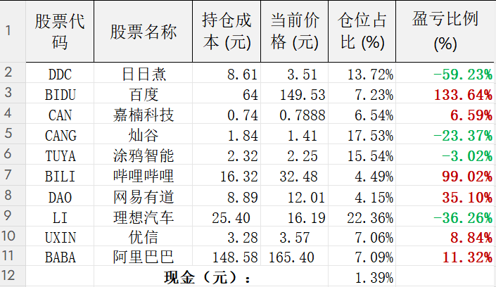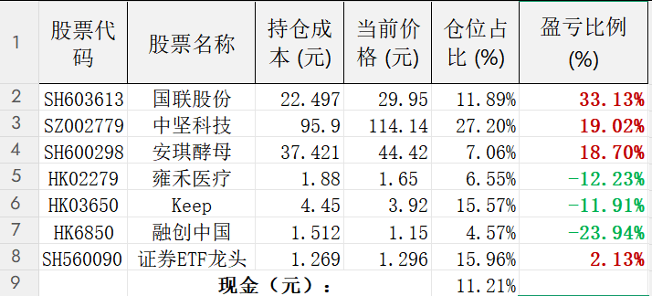 当前仓位分布表: