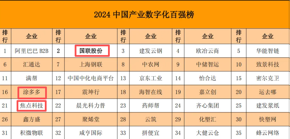 近期焦点科技涨的火热,看评论区有人把这份《2024 中国产业数字化百强榜》给扒了出来,在该榜中国联股份排名第二,国联子公司涂多多排名第十六,焦点科技排名第二十一,分享上来给大家简单做个参考吧。