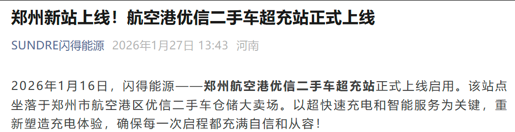 2026年1月16日,闪得能源在郑州航空港优信二手车超充站正式上线启用,本事对于优信的利好(AI总结):