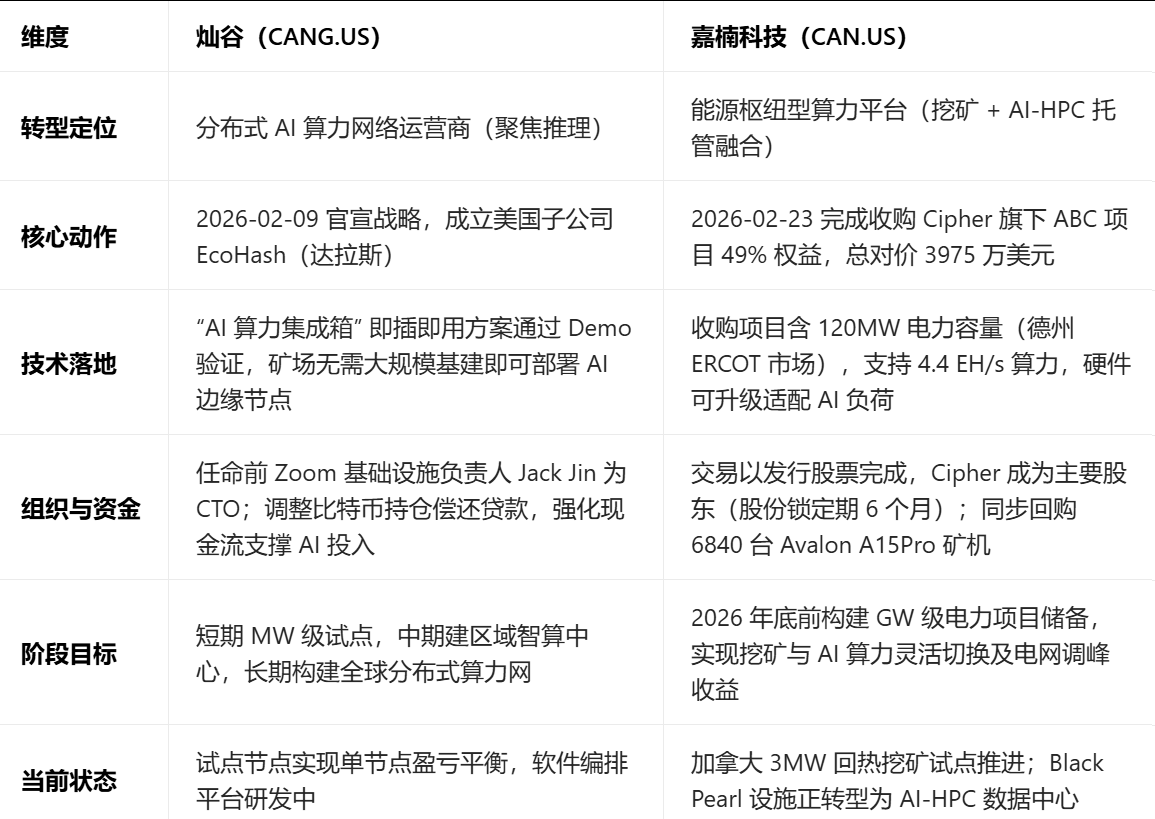 直接贴表格了,目前灿谷做的是分布式 AI 算力网络快速落地,嘉楠做的是能源基建为核心,算力灵活切换