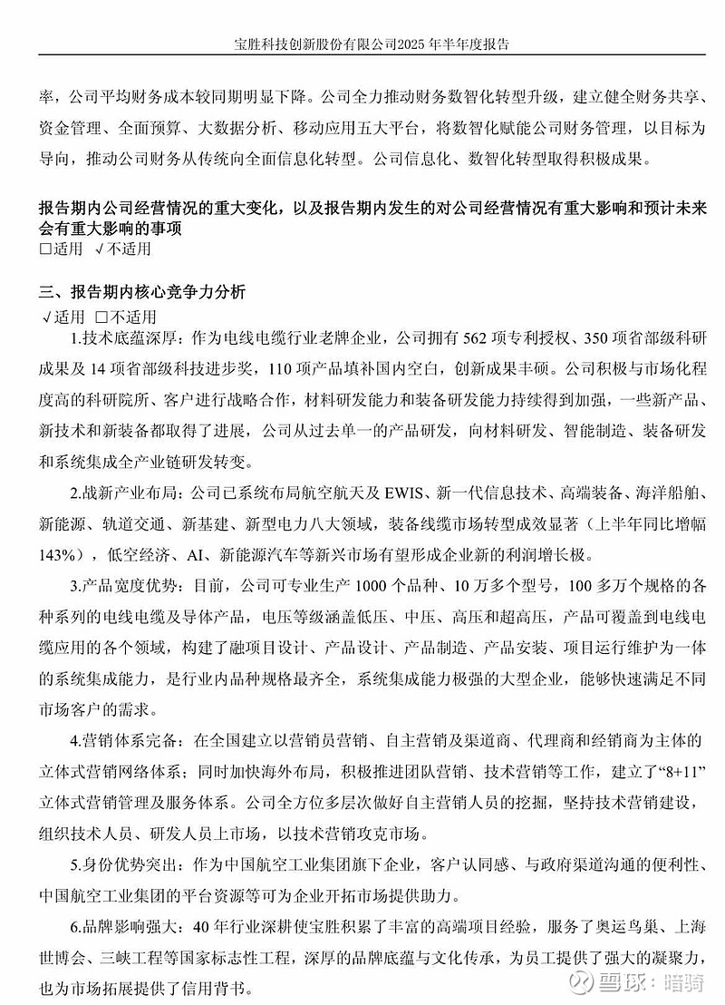 $宝胜股份(SH600973)$ 战新产业布局:公司已系统布局航空航天及EWIS、新一代信息技术、高端装备、海洋船舶、新能源、轨道交通、新基建、新型电力八大领域,装备线缆市场转型成效显著(上半年同比增幅143%),低空经济、AI、新能源汽车等新兴市场有望形成企业新的利润增长极。$长飞光纤(SH601869)$ $华胜天成(SH600410)$