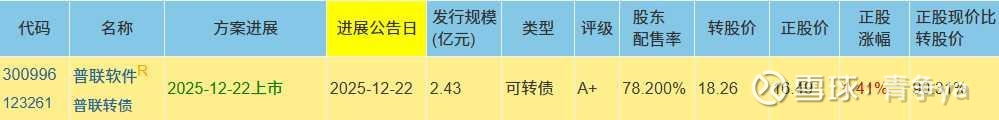 普联转债正股普联软件(300996),深市上市公司,属于计算机-软件开发-垂直应用软件行业,网上规模0.53亿,评级A+级,正股现价比转股价90.31%