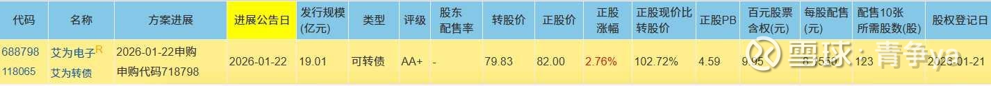 艾为转债正股艾为电子(688798),沪市(科创板)上市公司,属于电子-半导体-模拟芯片设计行业,发行规模19.01亿,评级AA+级,正股价82元,转股价79.83元,配售10张所需股数123股。