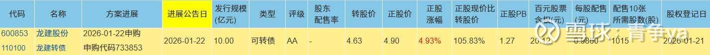 龙建转债正股龙建股份(600853),沪市上市公司,属于建筑装饰-基础建设-基建市政工程业,发行规模10亿,评级AA级,正股价4.9元,转股价4.63,配售10张所需股数1015股。