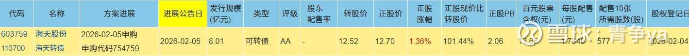 海天转债正股海天股份(603759),沪市上市公司,属于环保-环境治理-水务及水治理行业,发行规模8.01亿,评级AA级,正股价12.7元,转股价12.52元,正股现价比转股价101.44%,配售10张所需股数577股。