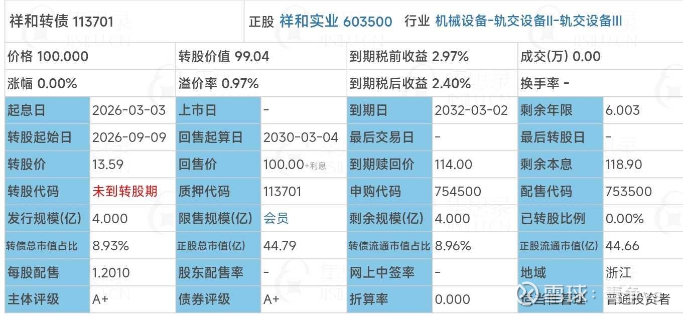祥和转债正股祥和实业(603500),沪市上市公司,属于机械设备-轨交设备Ⅱ-轨交设备Ⅲ行业,发行规模4亿,评级A+级,正股现价比转股价99.04%。