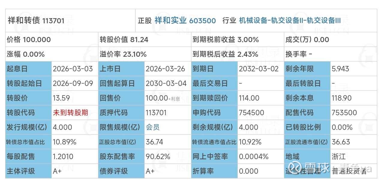 祥和转债正股祥和实业(603500),沪市上市公司,属于机械设备-轨交设备Ⅱ-轨交设备Ⅲ行业,网上规模0.38亿,评级A+级,正股现价比转股价90.62%。