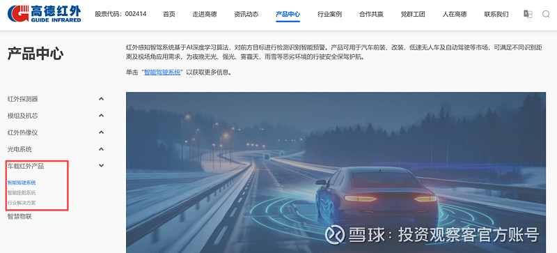 根据公司最新披露信息,车载红外领域,公司已获得了比亚迪、吉利、极氪、长城、广 汽、滴滴、陕汽等十多家在乘用车、商用车领域头部企业用于辅助驾驶、 智能驾驶应用的定点项目,今年,坦克 400、坦克 500、极氪 9X 等多个 红外定点热门车型陆续上市,其中极氪 9X 搭载的公司的红外产品实现了 全球首个红外 AEB(自动紧急制动)功能的量产落地。公司正在持续跟进智能驾驶的研发和市场推广工作。今年前三季度,车载产品的出货量实现了规模的突破,未来随着更多车厂车型的应用,车载产品的出货规模将持续提升。 此外,公司第一代车载 4D 毫米波成像雷达产品已获得小批量订单并 实现交付。未来,公司将围绕红外热成像以及激光、微波等多维感知技 术,持续深耕车载市场,为汽车行业和智驾时代提供更多产品和解决方 案。